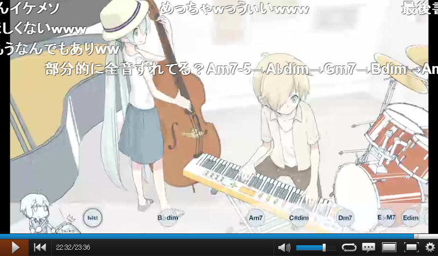 曲のテンポ130っていうのと、動画の1秒29.97フレームっていうのがうまく噛み合わなくてループさせるとどうあがいてもだんだんズレていくんですよ。アァァッッ!右から流れてくる丸をひたすらHITさせる作業はもうコリゴリだッ!コリゴリだッ!!死ぬかと思ったッ!(太鼓が一番大変だった)